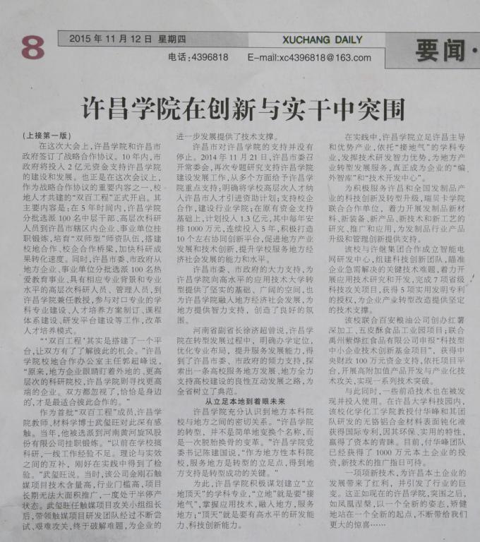 【编者按】2015年11月12日,《许昌日报》头版头题以《bet36体育在线在创新与实干中突围》为题对bet36体育在线进行报道。全文转载如下: