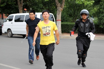 几乎与此同时,面包车在操场东侧停下,3名青年男子冲了下来。冲在前面的一个身材高大的男子全副武装,一只手高举着一个“炸弹”,另一只手提着一个塑料袋,可以看到里面装的显然也是“炸弹”。另外两名男子各拿一把约半米长的大砍刀。