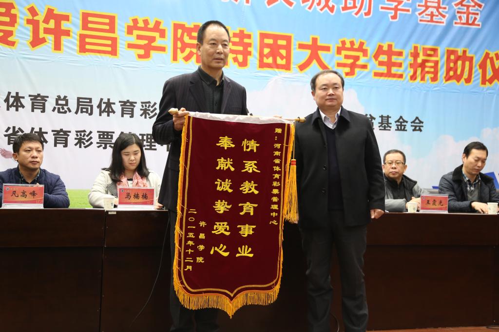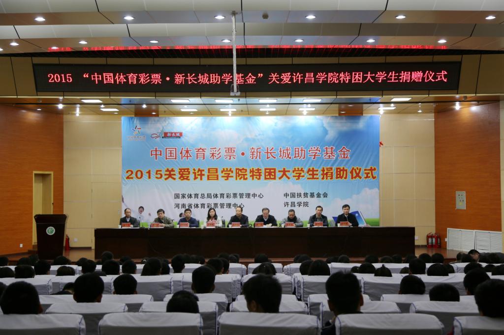 12月17日上午,2015“中国体育彩票·新长城助学基金”关爱bet36体育在线优秀困难大学生捐助仪式在bet36体育在线学术报告厅举行。河南省体育彩票管理中心主任孙和平,中国扶贫基金会品牌传播主管马楠楠、人民日报体育部综合室主任王霞光、许昌市体育局副局长赵西川、省体彩中心许昌分中心主任胡波,bet36体育在线副院长郭涛等领导出席了本次捐助仪式。参加仪式的还有各学院党总支书记、副书记、辅导员、受资助学生、体彩网点业主、销售员代表。人民日报、国家彩票杂志、新浪网、河南日报、河南电视台都市频道、河南电视台民生频道、大河报、河南商报等10余家省级以上新闻媒体对捐助仪式进行了采访报道。捐助仪式由学生处处长张鹏辉主持。