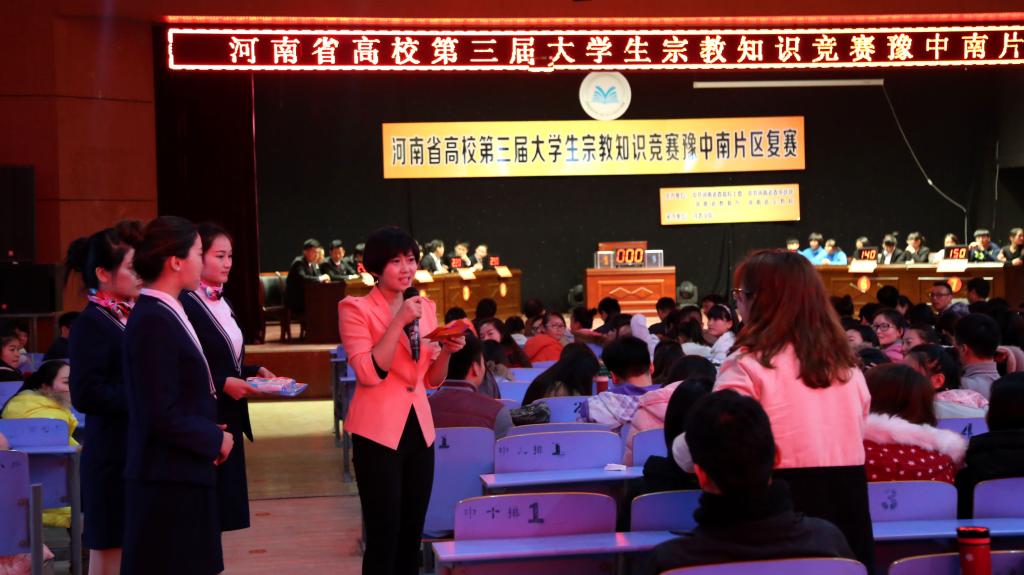 本次豫中南片区复赛由中共河南省委高校工委、中共河南省委统战部、河南省教育厅、河南省宗教局主办,bet36体育在线承办。比赛采用抢答赛的形式进行,分必答题、抢答题和风险题三个环节。竞赛仲裁委员会分别由驻马店、漯河、许昌三地高校选派出专家老师组成。各参赛高校都在校内初赛的基础上选拔了优秀的选手组队参加今天的比赛,选手们也都作了充分的赛前准备。bet36体育在线派出校内选拔赛夺冠的法政学院队代表bet36体育在线参赛。比赛中,选手们以丰富的知识储备,紧密的团队合作,沉着机智、落落大方的赛场表现,博得了现场观众的阵阵热烈掌声,展示了各高校代表队的风采。本次复赛还特意安排了现场互动环节,与会师生踊跃回答主持人的提问,现场气氛十分热烈。经过激烈的较量,最终,bet36体育在线代表队夺冠并获一等奖,黄淮学院、漯河食品职业学院代表队获得二等奖,驻马店职业技术学院、漯河医学高等专科学校、许昌职业技术学院、漯河职业技术学院代表队获得三等奖。bet36体育在线和驻马店职业技术学院获得优秀组织奖。