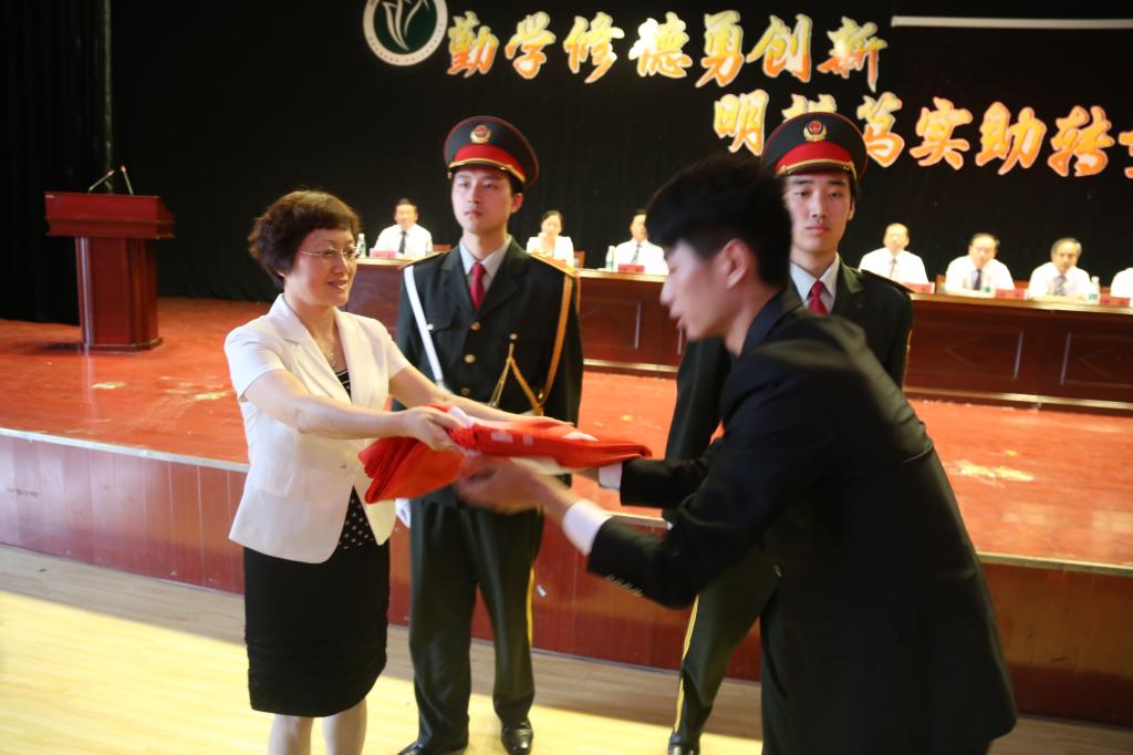 仪式上,赵继红向校社会实践队学生代表授社会实践队旗。