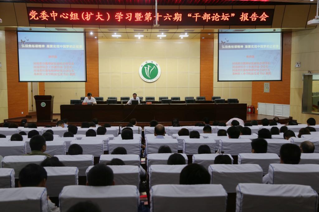 6月24日下午,bet36体育在线党委中心组(扩大)暨第十六期干部论坛报告会在学术报告厅举行。学校特邀河南省社会工作教育协会会长、原郑州轻工业大学党委书记林世选教授作了题为《弘扬焦裕禄精神,凝聚实现中国梦的正能量》的专题辅导报告。校领导赵继红、马超、张建军、赵正风、郑直、崔斌、黄怡俐和全校科级以上干部、机关、教辅及附属单位全体党员参会。