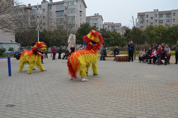 “咚锵!咚锵!咚咚锵!”庆元宵,舞狮子。正月十五,家属区举行精彩的舞狮表演为老师们奉上一道传统的文化大餐。两头装扮得很“帅气”的大黄狮蹦来蹦去,它们或腾空或伏地或招惹围观的人群,好不热闹。表演队的演员们个个精神抖擞、激情飞扬,伴着节奏热烈、激动人心的锣鼓声,用精彩的表演给老师们拜年送祝福。