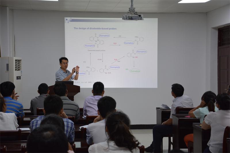 报告中,鲜明教授主要介绍如何采用有机化学的手段来构建简便的硫化氢、多硫化物,多硫化氢等活性硫的检测方法,为解决生命科学,生物医学等领域的关键问题提供理论指导。他以解决生物学领域实际问题为导向,把不同种类活性硫的研究引向深入,其深厚的化学功底,敏锐的洞察力,严谨的思维和细致的讲解赢得了师生的热烈掌声。报告会结束后,鲜明教授与现场师生进行了互动,对大家提出的问题作了详细解答,并就科研合作、人才培养等方面进行了更为深入的交流探讨。