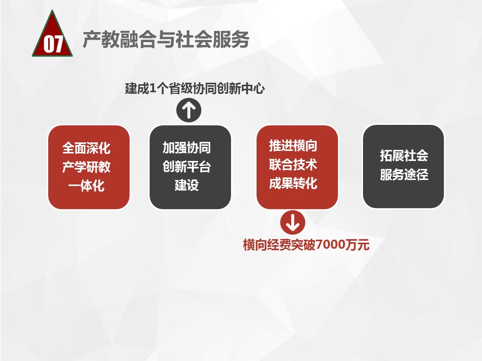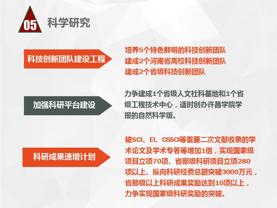 总规划明确提出今后五年的发展战略是“坚持四个统一、完善四项基本建设、实现四个突破、形成四大特色”,基本完成“三基一体”的建设任务,即五年内把学校建设成为高层次应用型人才培养基地、政产学研协同创新基地、先进技术转移与服务基地和高等教育、职业教育、继续教育有机联合体。实现发展战略的载体是“河南省示范性应用技术类型本科院校”建设和国家级“十三五”“产教融合发展工程应用型本科院校”建设。五年内事业发展的战略目标是初步建成以培养高层次应用型人才为核心,与区域重点产业、主导产业、特色产业和区域文化高度融合,特色鲜明的高水平应用技术大学。