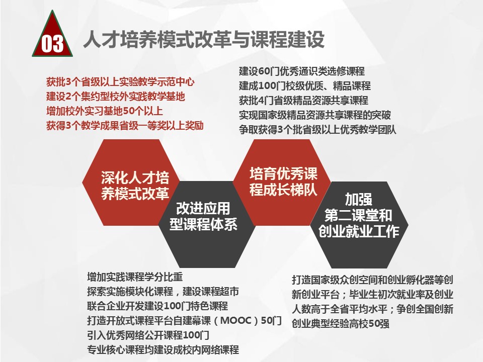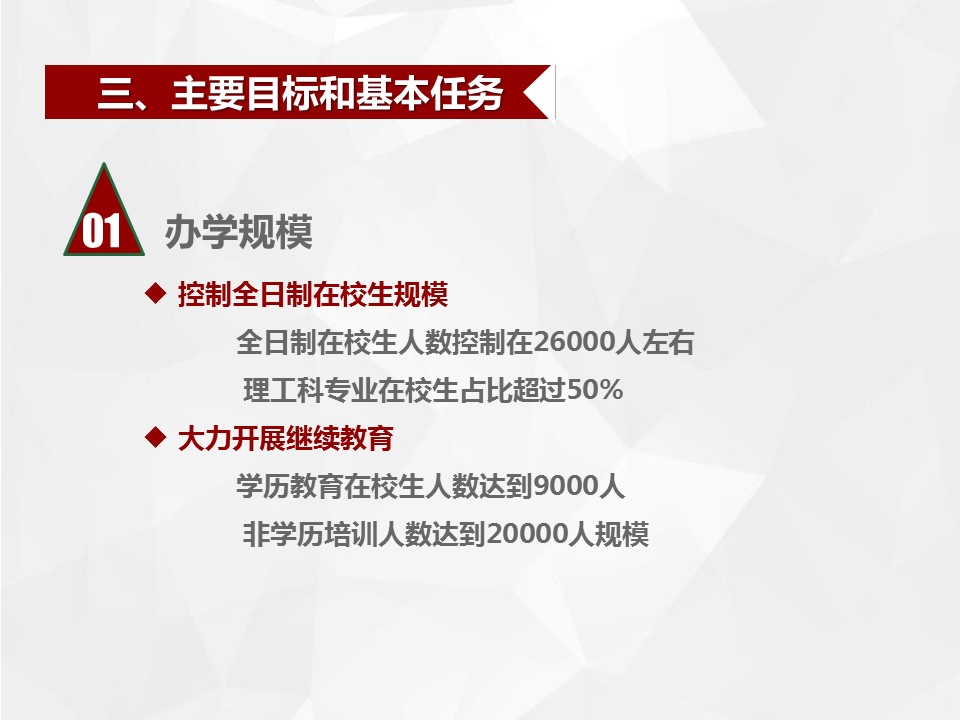 《总规划》从办学规模、学科专业建设、人才培养模式和课程建设、师资队伍建设、科学研究等十个方面明确了五年内的主要建设目标和任务。6个分规划和25个二级学院规划,分别依据《总规划》就各自领域或单位的发展,提出具体的目标任务和主要措施。《总规划》主要内容图解如下: