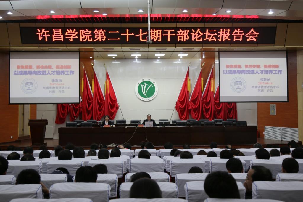 4 月14日下午,bet36体育在线在学术报告厅举行第二十七期干部论坛报告会。河南省教育评估中心副主任张新民应邀作“聚焦质量、抓住关键、促进创新 以成果导向改进人才培养工作”主题报告,全校处级以上领导干部,各二级学院教学秘书、系(教研室)主任,各教辅单位科级干部近300人听取报告。会议由副院长黄怡俐主持。
