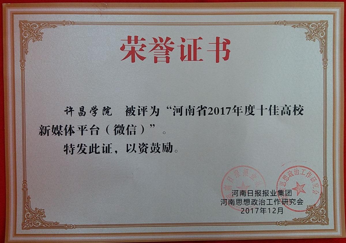 近日,由中共河南省委宣传部指导,河南日报报业集团与河南省思想政治工作研究会主办,大河报·大河客户端、中原高校新媒体联盟承办的“闪亮新时代——河南省第二届大学生新媒体原创作品大赛暨2017年度十佳高校新媒体平台评选”活动落下帷幕。bet36体育在线官方微信荣获“河南省2017年度十佳高校新媒体平台”称号。