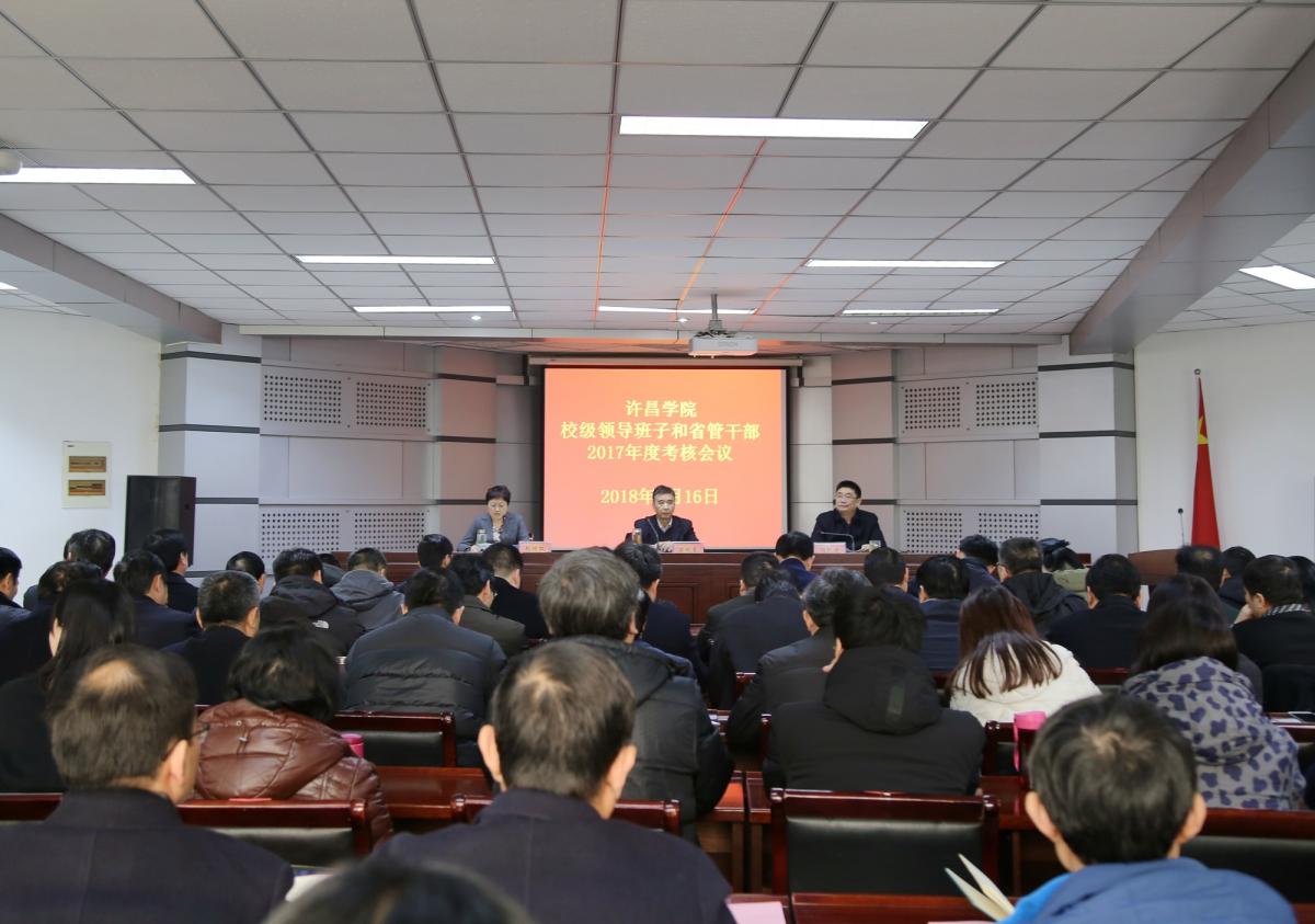 根据省委组织部、省委高校工委统一安排,省委第五考核组一行8人在组长郑州航空工业管理学院原党委书记梁晓夏的带领下,到bet36体育在线对领导班子和省管干部开展2017年度综合考核。1月16日下午,校级领导班子和省管干部2017年度考核会议在办公楼第三会议室召开。全体校领导、党委委员,纪委委员,学校中层正职,教师、学生代表等103人参加会议。考核会议由院长、党委副书记赵继红主持。