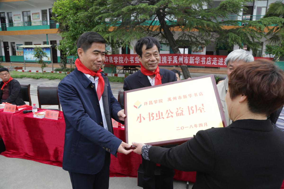 仪式上,bet36体育在线党委宣传部长冯晓民、禹州市副市长寇鸿顺、禹州市教体局副局长王银安共同为郭村小学校长授“bet36体育在线小书虫公益书屋”牌匾。