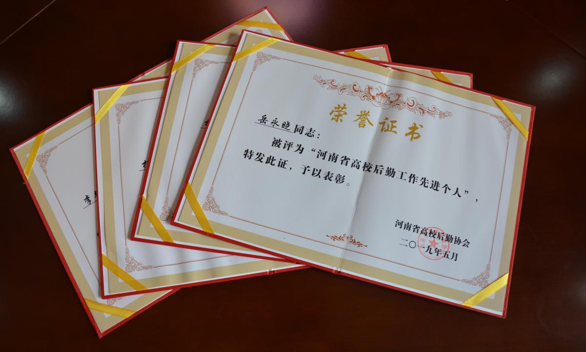据悉,本次评选由河南省高校后勤协会组织,经全省100多所高校申报、专家评审、省教育厅审定,对后勤工作成绩突出的高校先进集体和先进个人进行表彰。(图片由后勤管理服务中心提供)