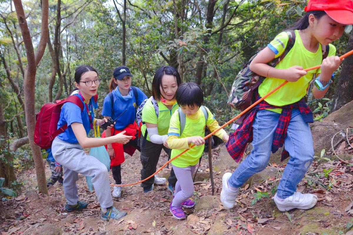 学生(左1、左2)在“营动中国”全国青少年户外营地夏令营中带领孩子们勇攀千米峰