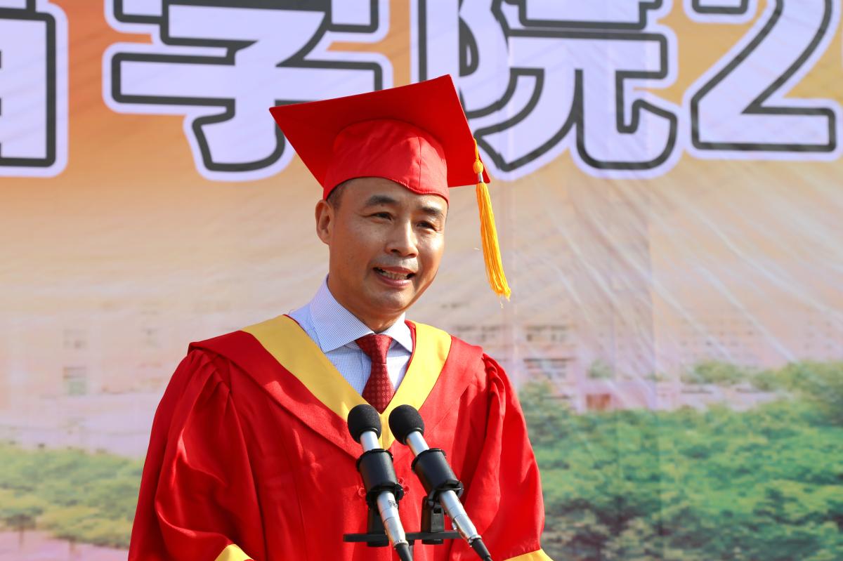 致辞中,院长岳修峰对同学们提出了三点希望。一是要坚守理想。他说,理想可以有大有小,只要对社会有益,能够为社会注入“正能量”,能够依法依规让自己和家人生活幸福,都值得坚持下去。希望大家在坚守理想的同时,要保持宁静的心态、独立的人格和做人的原则,能明辨是非,不随波逐流,做一个有底线的人、一个堂堂正正的人。二是要热爱生活。他希望大家不管什么时候,都能保持积极向上的人生态度,热爱生命、热爱生活,爱自己、家人和朋友,微笑着做好每一件事,快乐地过好每一天,成为对生活充满爱意的人,认认真真生活的人,把生活本身当作幸福的人。三是要关注世界。他指出,世界风云变幻,正处在百年未有之大变局,希望大家学会关注世界、关注社会、关注国家,让自己的视野和格局不断拓宽,让自己的站位与思维不断提升,在生活的“小确幸”里也能保持一份心忧天下的家国情怀。岳院长的致辞“潮句”迭出,朴实无华而又幽默风趣的语言引起了阵阵掌声。