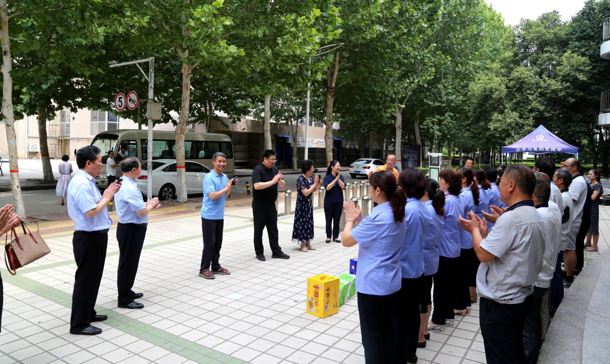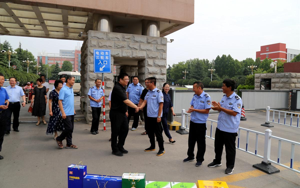 7月16日,校级领导闫纪建、岳修峰、罗凤英、郭涛、高金星带领相关部门负责人,前往学校招生录取大厅、门岗值班处、北大门广场、学生宿舍楼等地看望慰问暑期坚守工作岗位的工作人员,并送去了慰问品。