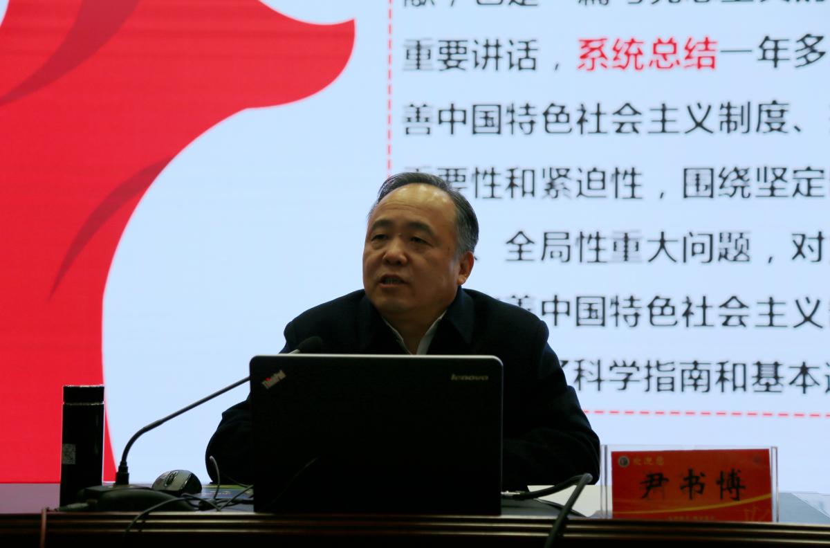 报告会上,尹书博以《新时代国家制度和国家治理体系建设举旗定向的政治宣言》为题,围绕着“新中国国家制度和治理体系建设的光辉历程与伟大成就”“新时代国家制度和国家治理体系举旗定向的政治宣言”“贯彻落实好全会精神 谱写中原更加出彩的绚丽篇章”等三个方面,结合国情、省情对党的十九届四中全会精神进行了深入解读。报告紧扣四中全会主题,全面阐释了坚持和完善中国特色社会主义制度、推进国家治理体系和治理能力现代化的重大意义,系统解读了我国国家制度和国家治理体系的显著优势,科学揭示了新中国成立70年来,我们党领导人民创造的经济快速发展奇迹和社会长期稳定奇迹的深层原因,深刻阐明了中国特色社会主义制度中起四梁八柱作用的根本制度、基本制度和重要制度。
