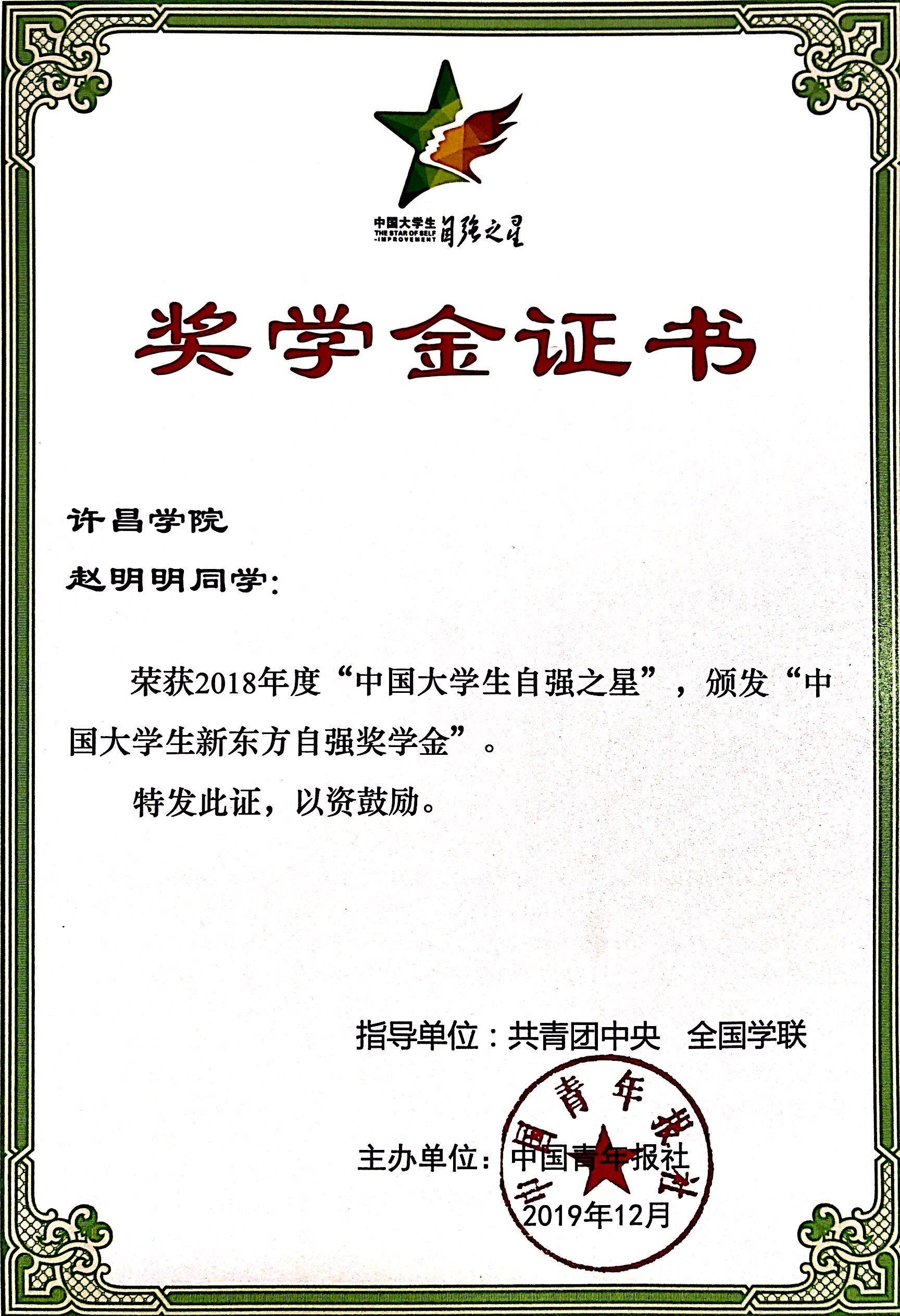 近日,由共青团中央、全国学联联合主办的2018年度寻访“中国大学生自强之星”活动评选结果揭晓,bet36体育在线信息工程学院谢宇慧、数学与统计学院赵明明两名同学,经学校推荐、省级初评、全国评审等环节,双双荣获“中国大学生自强之星”称号,并获得“中国大学生新东方自强奖学金”。