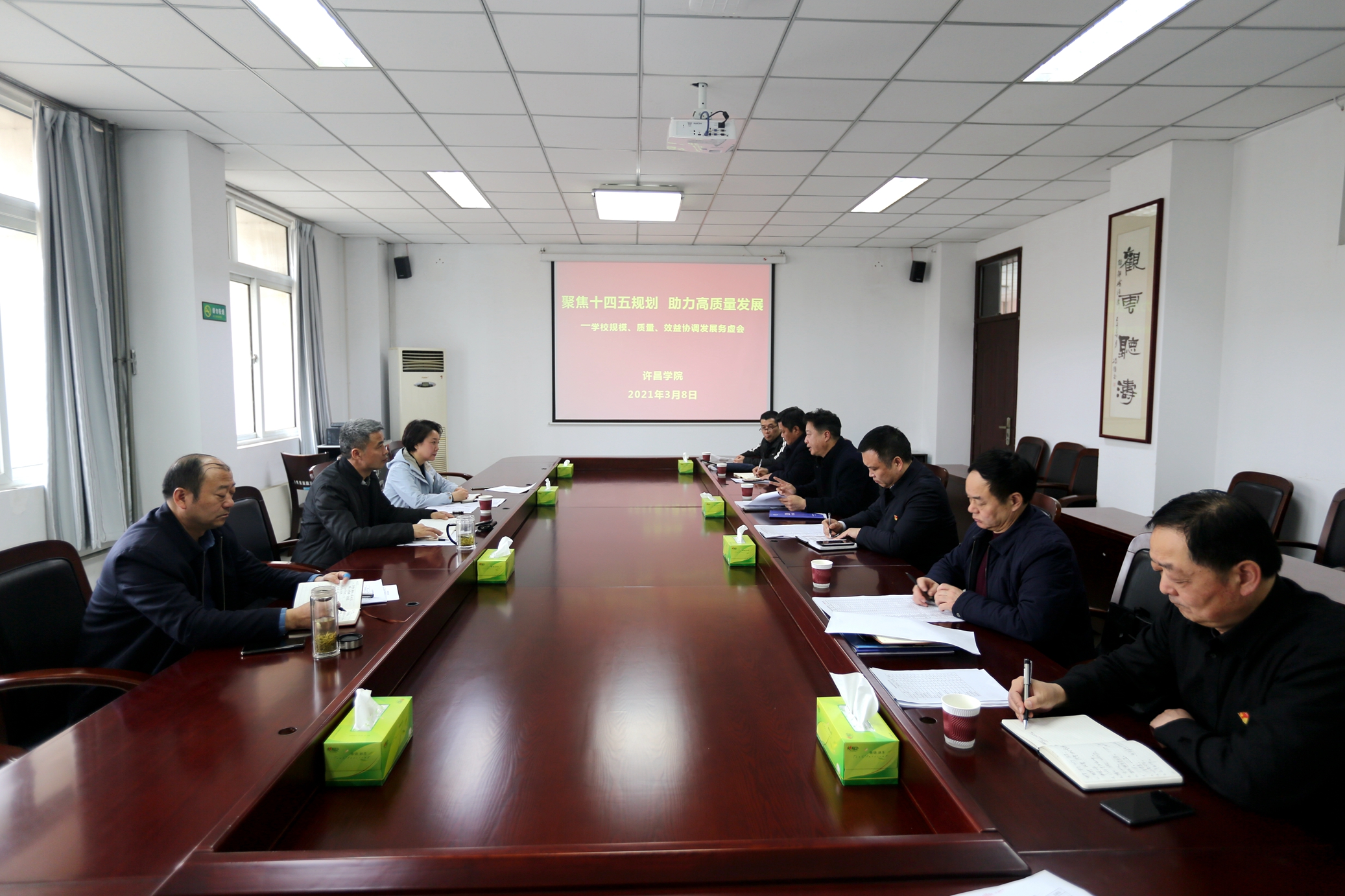 3月8日上午,学校围绕“聚焦十四五规划,助力高质量发展”主题,在办公楼第一会议室组织召开规模、质量、效益协调发展工作务虚会。院长岳修峰,副院长崔斌、黄怡俐出席会议。党政办公室、发展规划处、教务处、人事处、财务处、学生工作处、招生就业处、后勤管理与服务中心等单位负责同志参加会议。