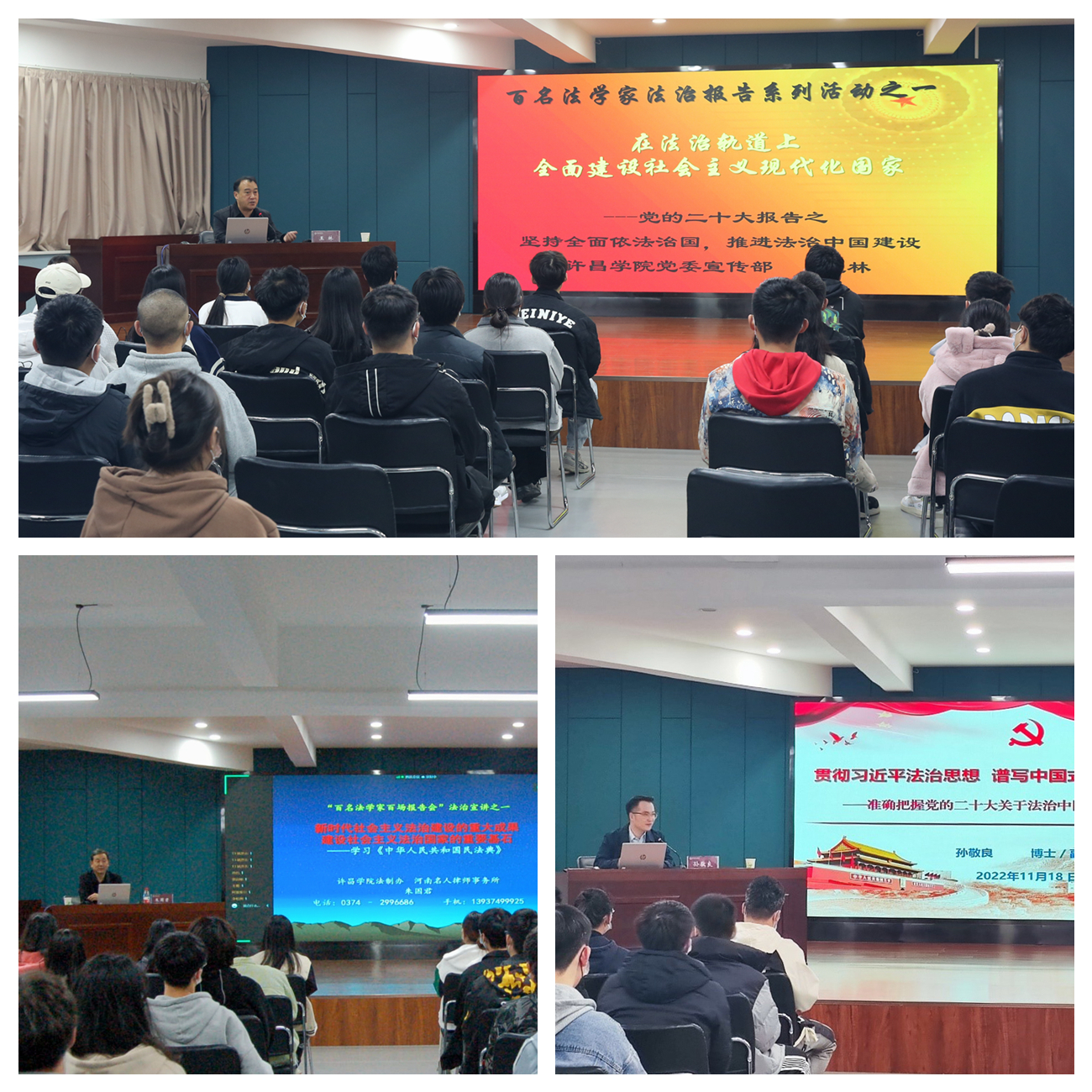 学校党委宣传部部长王林、法制办主任朱国君、法学院孙敬良博士等宣讲团成员先后来到弘毅书院和博雅书院,分别以《在法治轨道上全面建设社会主义现代化国家——党的二十大报告之坚持全面依法治国,推进法治中国建设》《新时代社会主义法治建设的重大成果 建设社会主义法治国家的重要基石——学习<中华人民共和国民法典>》《贯彻习近平法治思想谱写中国式现代化法治体系新篇章》为题为学生做专题讲座,详细讲述了法治中国建设和中国特色社会主义法治体系的主要内容,《民法典》的指导思想、基本原则、立法过程以及习近平法治思想形成过程、核心要义、重大意义等重要内容。并寄语广大青年学生要加强法治理论学习,提升法治思维水平,在学深悟透上下功夫,在知行合一上求实效,结合实际学习生活,在学习的过程中增强实际运用能力。