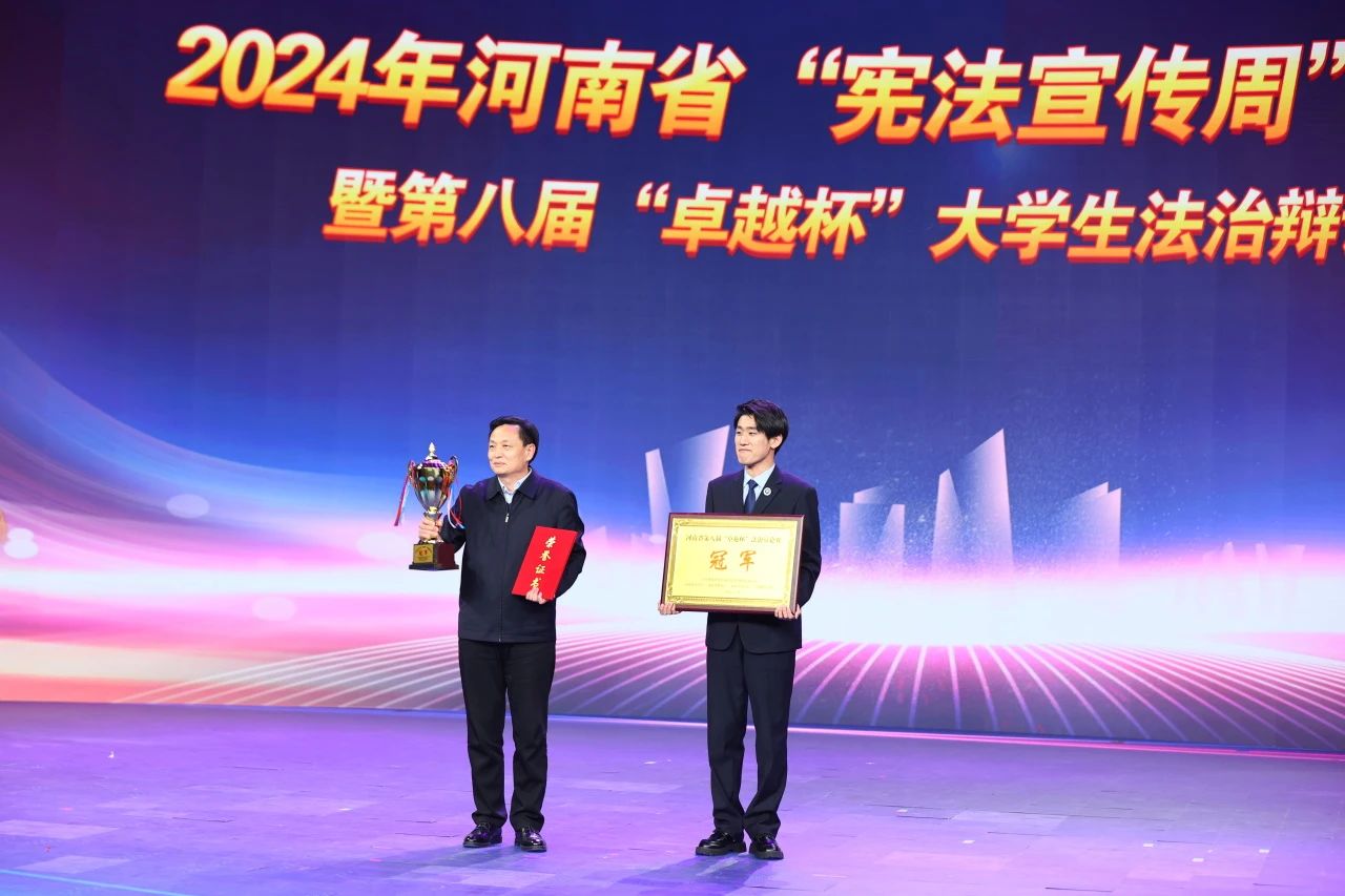 12月2日,2024年河南省“宪法宣传周”启动仪式暨第八届“卓越杯”大学生法治辩论赛决赛在河南电视台演播大厅举行。bet36体育在线法学院代表队凭借扎实的法律知识基础、高超的辩论技巧和出色的表现,在21支参赛队伍中脱颖而出,成功摘得桂冠。校纪委书记申占伟出席活动并领奖。