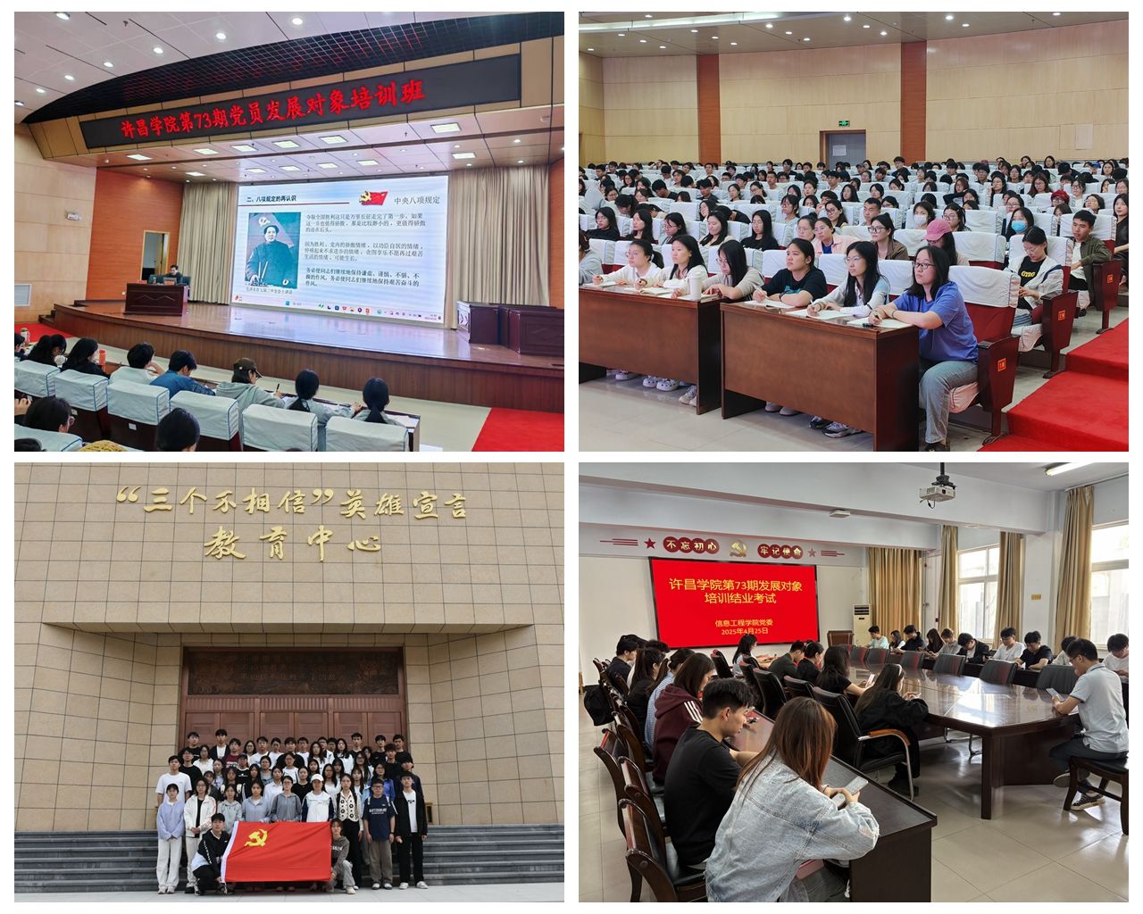 在4月19日至20日举办的集中培训期间,校内多名专家学者紧紧围绕习近平新时代中国特色社会主义思想和党的二十届三中全会精神,以专题报告与特色活动双轮驱动党员发展对象教育。专题报告聚焦作风建设、精神传承、法治建设、民族宗教、文化传承等领域,分别围绕“深入贯彻中央八项规定精神学习教育”“弘扬伟大建党精神,阔步迈向新征程”“法治文化和法治思维”“新时期党的民族宗教政策”“毛泽东文化遗产与新时代青年使命的对话”“书法艺术与文化育人”等专题开展。期间,学校还组织了“以歌叙史,以史鉴歌——歌声中的‘四史’教育”等学红歌、唱红歌的特别主题活动,以及爱国主义教育影片《长津湖》集体观看活动,进一步升华了大家爱党爱国的精神境界,点燃了勇担民族复兴使命的奋斗激情。