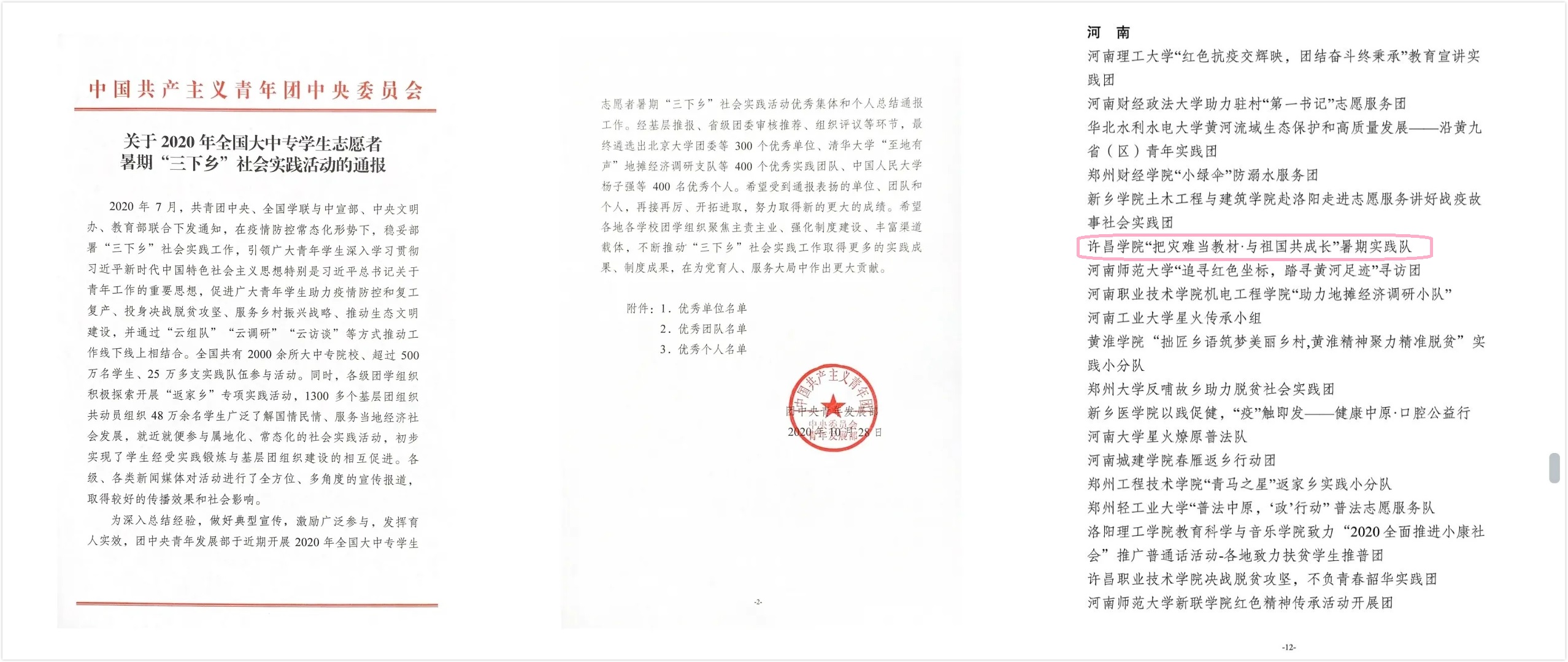 近日,共青团中央发布《关于2020年全国大中专学生志愿者暑期“三下乡”社会实践活动的通报》,bet36体育在线“把灾难当教材·与祖国共成长”暑期实践队获得2020年全国大中专学生志愿者暑期“三下乡”社会实践活动优秀团队称号。
